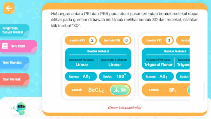 あなただけのオリジナル分子を構築し、その形状をリアルタイムで視覚化できるユニークな機能も備わっています。理論学習だけでなく、実践的な分子設計を通して理解を深めることが可能です。また、インドネシア語と英語の多言語に対応しているため、多様な学習ニーズに応えます。「Bentuk Molekul 3D Simulasi - Kimia」を通じて、視覚的に魅力的な体験とインタラクティブな学習方法で、分子化学への理解を飛躍的に深めましょう。