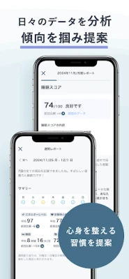 スマートフォン一つで、あなたの自律神経の状態を測定。指先から心拍変動のリズムを解析し、心身のエネルギーレベルやストレスの兆候を数値で可視化します。さらに、睡眠の質や日々の気分といったコンディションを記録することで、あなた特有のバイオリズムや不調のパターンを浮かび上がらせます。Habitoneが提供する分かりやすいレポートは、漠然とした不調の原因を明確にし、具体的なセルフケアへの第一歩を支援します。