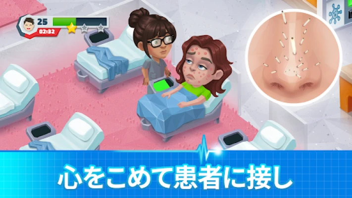 時間管理の腕が試される、やみつきになるゲームプレイがあなたを待っています。看護師の感動的な物語が秘められた記憶を解放し、数々の刺激的なステージとロケーションを巡りましょう。研究センターを自分好みに装飾し、革新的な治療法や薬を開発して、世界中のユニークな患者さんたちとの出会いをコレクションしてください。無限に楽しめるエンドレスモードや、研究センターで定期的に開催される特別なイベントなど、『HappyClinicGame』は尽きることのない喜びと発見を提供します。
