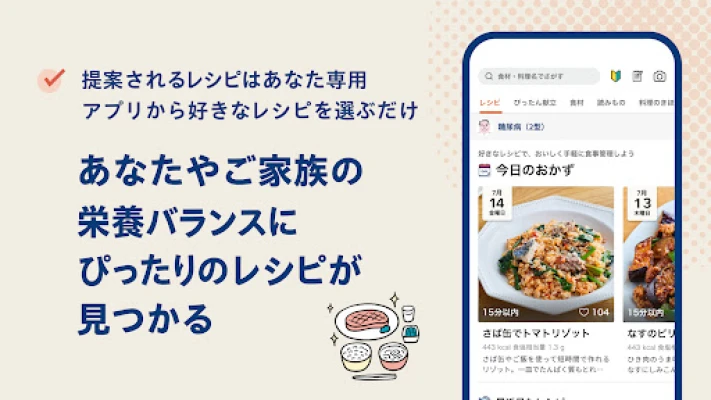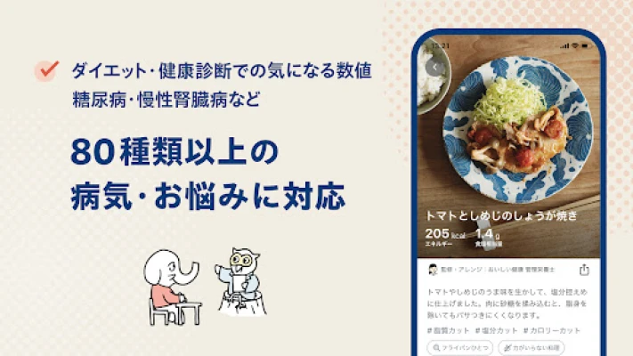 「おいしい健康」は、管理栄養士監修の約1万品レシピで食事管理をサポート。糖尿病、高血圧、ダイエットなど約80種の悩みに合わせ、あなたにパーソナライズされた献立で健康的で美味しい食生活を実現します。