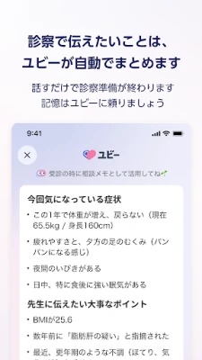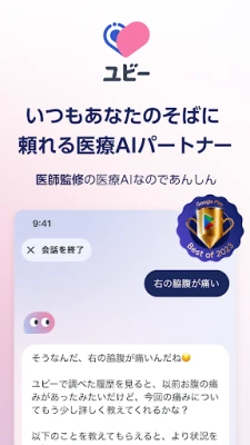 「ユビー : 医療AIパートナー」は、24時間いつでも健康や病気の悩みを気軽にチャット相談できるAIです。症状の不安から日々の健康管理まで親身にサポートし、適切な受診先案内やオンライン診療も可能。プライバシーを守りながら、あなたの頼れる健康パートナーとなります。