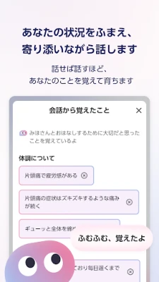 誰もが抱える健康の不安や疑問。医療AIパートナー「ユビー」は、そんなあなたのそばに24時間寄り添い、いつでも気軽に相談できる頼れる存在です。まるで友人と話すように、チャット形式で体調の悩みや症状の不安を打ち明けてみてください。専門的な医療知識がなくても、AIが分かりやすい言葉で丁寧に解説し、あなたの話を深く理解。会話を重ねるごとに「ユビー」は成長し、一人ひとりの状態に合わせた最適なアドバイスを提供します。